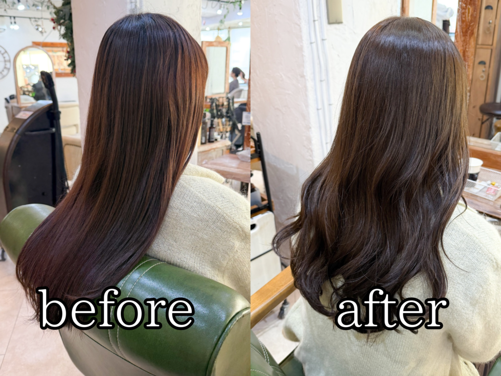 なので染めたては来店してくださった時と同じくらいの明るさですが、1ヶ月後には1トーン明るくなっている選定です!