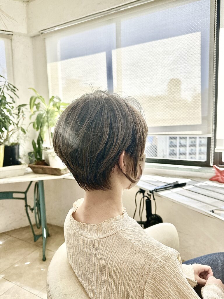 襟元をくびれさせて耳にかけるとさらにスッキリするショートスタイルです